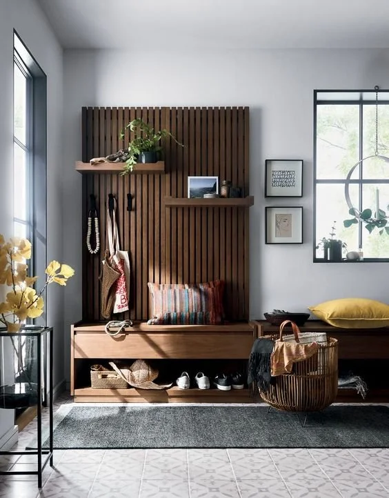 Using storage benches like this one from Crate & Barrel are great for entryways. It allows plenty of space for those things you want to drop off right as you enter your home, and a place to gather yourself and things before leaving your house for the day. It fits perfectly into entryway spaces— almost looking as if it was built into the area.