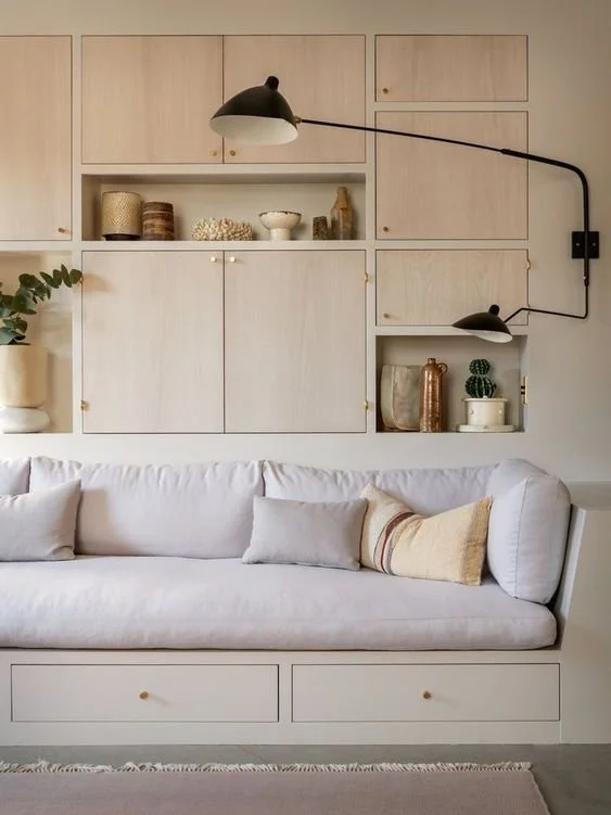 The couch above sits on top of storage drawers, a great example of how you can double a couch as a place to sit and store belongings. Having the surrounding built-in storage makes the overall space look cohesive and seamless with just the right amount of detail to show off one’s personal taste.