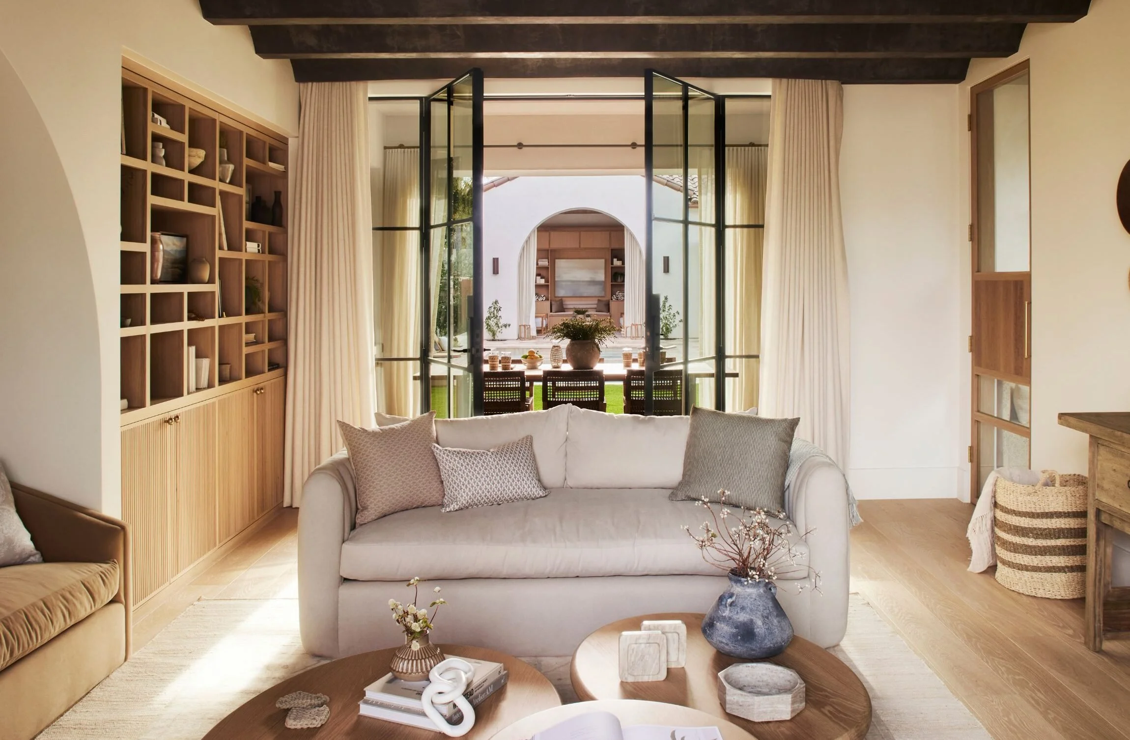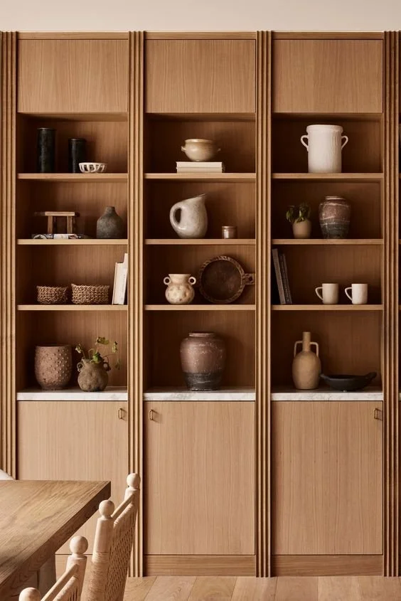 This home by Lindye Galloway uses the most out every wall to create built-in storage that can show as much or as little of your things as you desire. By utilizing a lot of the wall space, storage within the room is intentional and tidy.